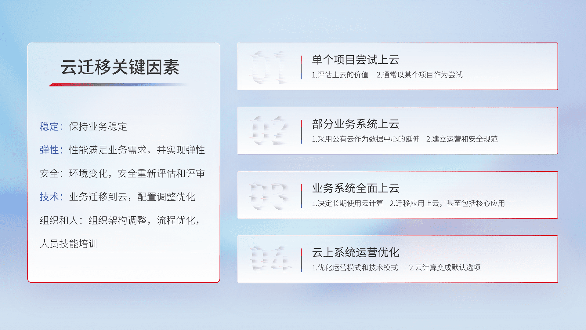 结合实际业务,,,,从规划设计、、、、云平台选型、、云原生改造、、数据迁移、、集成交付,,迁移全过程为客户识别最佳上云路径,,,做好风险识别管理,,设计网络架构、、、、身份权限、、、安全审计合规、、操作审计、、日志审计、、、监控告警策略、、、多站点容灾设计等,,,,对云上基础设施进行整体规划,,提升IT治理水平,,,以满足弹性、、、高可用、、、、高性能的需求。。。
